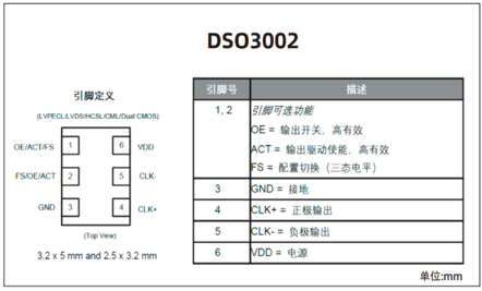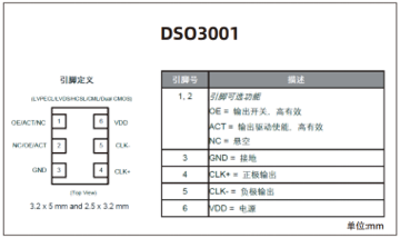 | DSO3001 DSO3002 DSO3003 | 3.2*2.5*0.8 5.0*3.2*0.8 | 差分:10KHz~350MHz 单端:10KHz~212.5MHz | ±50 | -40 ~ 85 | LVDS/LVPECL HCSL/CML/ LVCMOS 或 双路CMOS | 350fs |
